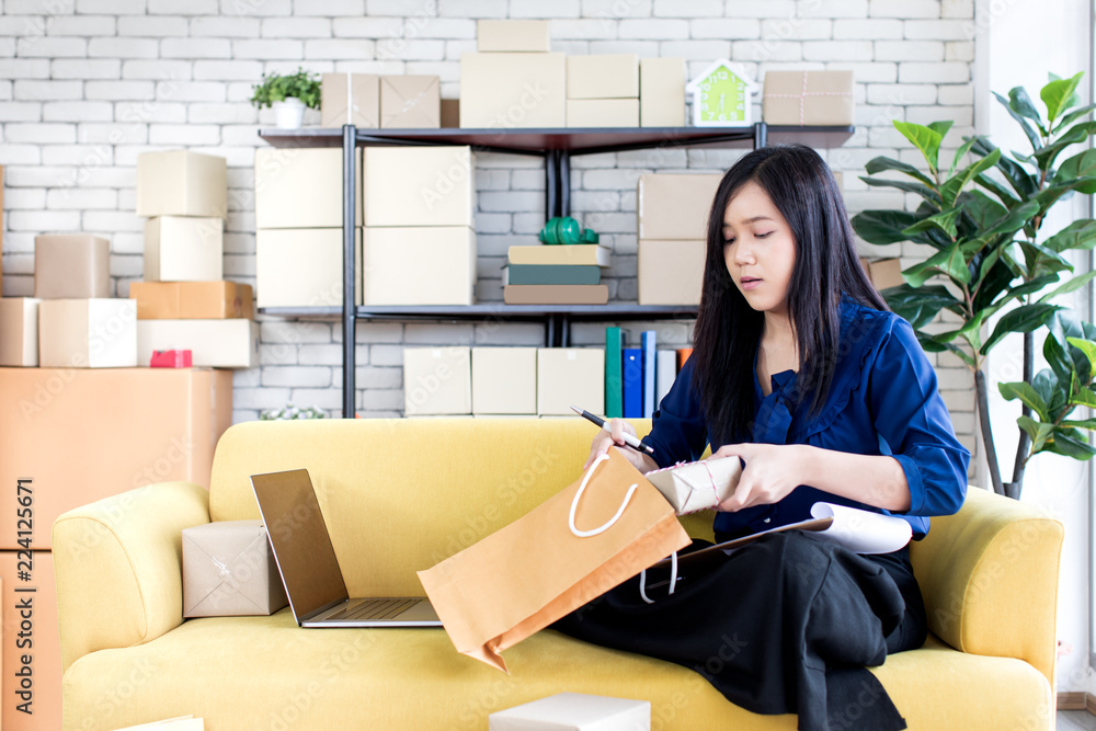 Young and beautiful Asian woman sitting among several boxes and Very well made.